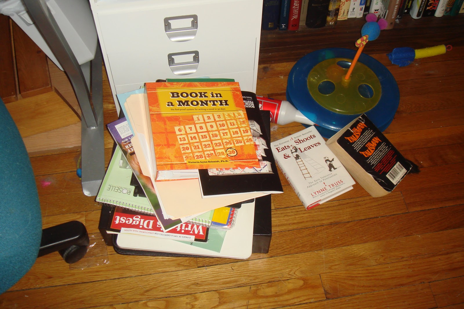 We can’t even use the desk since it’s stacked with SCBWI bulletins and Writer’s Digest back issues. Not to mention that the surrounding floor is littered with craft books and project notes. The piles on the floor are stacked precariously and by some divine intervention The White One hasn’t knocked them over yet.