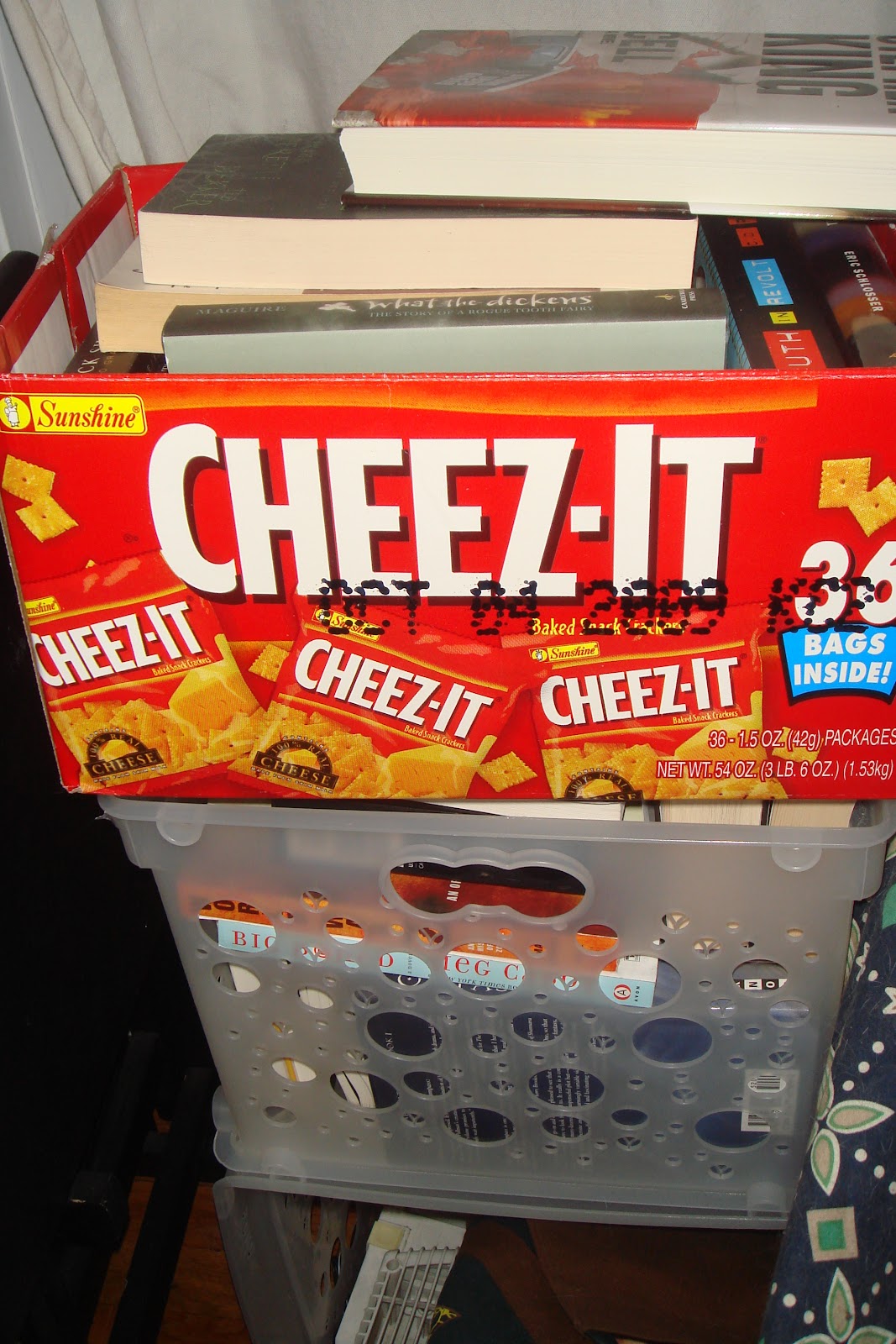 I feel your pain and share your addiction (although all FB showed was the Cheezit box–I have a mild addiction to those as well, but that's a discussion for another day). Why do we keep our books? Well, we're writers–that's a part of it. We know the blood, sweat and tears that go into producing these tomes. Plus, we're also voracious readers–we know the joy of the well-turned phrase, the moment of utter sweetness when a writer "gets it," the pleasure of losing hours because we've been sucked into another world by a skillful storyteller, and there is a part of us that cannot let go of it, and getting rid of the book would mean losing the opportunity to re-experience that moment of transportation–the loss of catharsis, even though we know the experience won't be the same the second time around.