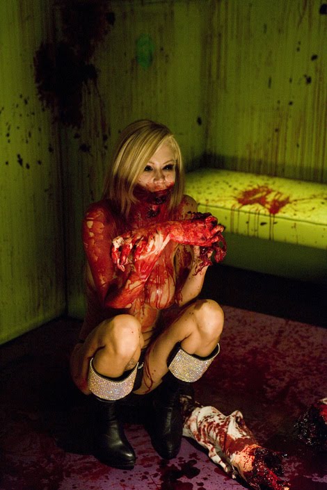 A huge success is Jenna Jameson’s first striptease as a zombie. Her outfit is amazing (and was apparently custom made for her) and it’s a shame that it doesn’t stay on for long. And while I don’t find her particularly attractive (her fake boobs are just a bit too big and, well, fake looking for my tastes), she is one athletic woman. I was pretty jealous of her flexibility on the pole and it made me want to start working out more! Another awesome zombie stripper is played by musician Roxy Saint. She plays the token goth stripper, Lilith, who eventually turns into one bad ass zombie. Her first zombie striptease is both disturbing and hot. And her zombie makeup and ‘look’ that they designed for her is by far the best in the film. She also has the best kill in the whole movie where she rips a man’s head in two by pulling open his jaws. Another high point in the film is a zombie stripper fight to find out who is the star of the club. It ends epicly when Kat shoots billiard balls out of her vagina. I am not lying about this.
